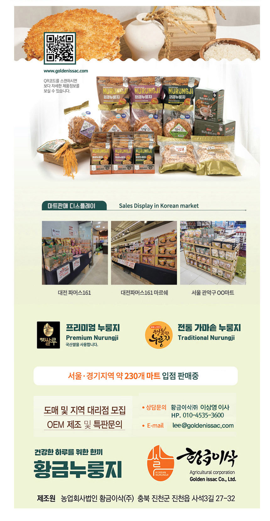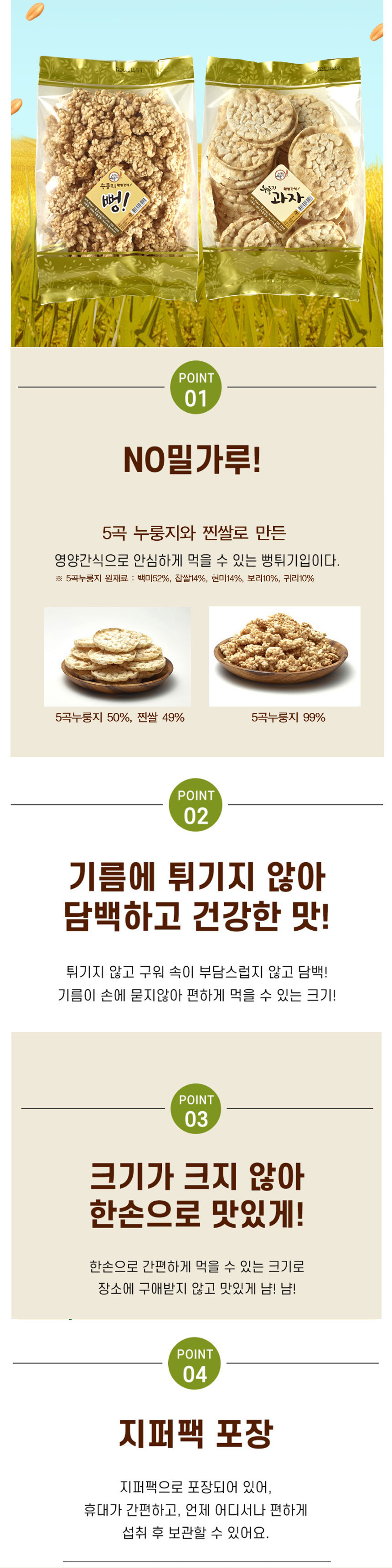"황금이삭 행복한누룽지"는 전통 무쇠솥으로 만든 누룽지 본연의 맛을 그대로 살리는 최적의 제조공법으로 만듭니다. 누룽지 본연의 황금빛 색깔과 더욱 구수한 맛을 내기 위해 타 누룽지에 비해 더 천천히 오래 굽고 품질기준도 엄격합니다 덜 구워져서 하얀 빛깔을 띄거나 조금만 더 구워져도 등외품으로 빼내는 깐깐한 누룽지입니다.